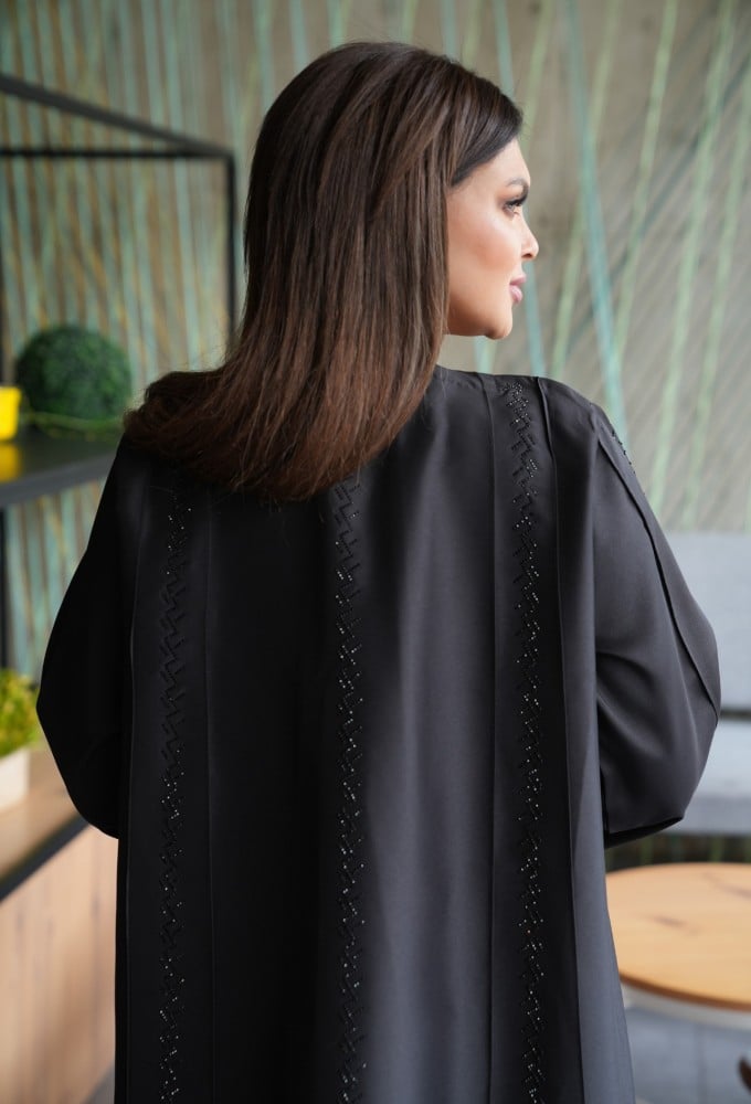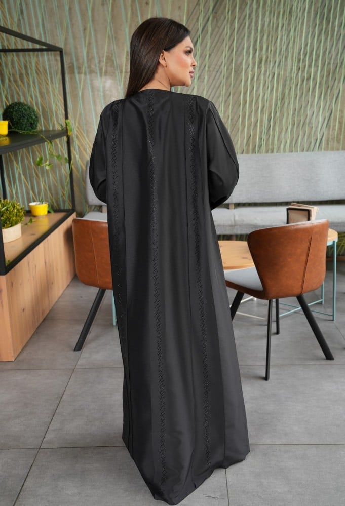 عباية أسود تفتة ايطالي مطفي بتطريز هندسي ناعم على كامل العباية من الأمام والخلف