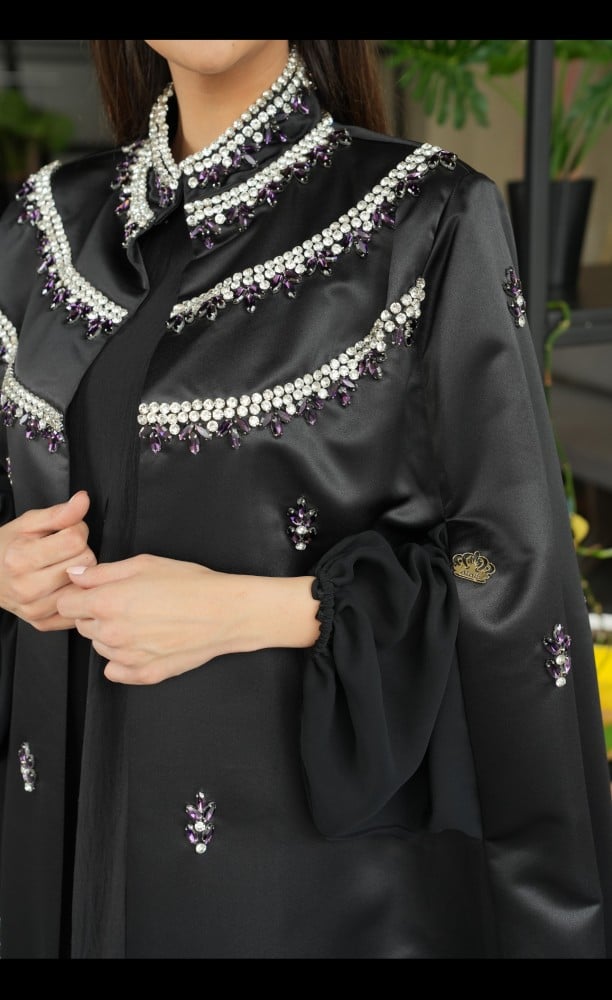 - مزيج متناغم: يجمع التصميم بين أناقة العباية السوداء وفخامة الشاح الملكي الفاخر بفصوصه الفضية، مما يخلق مزيجًا متناغمًا وجذابًا.