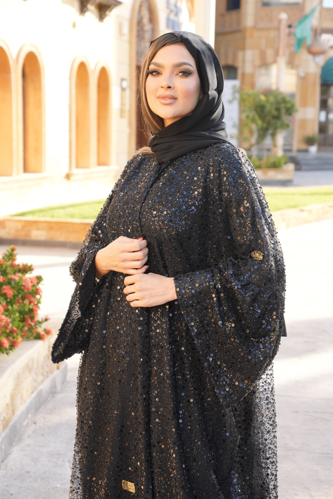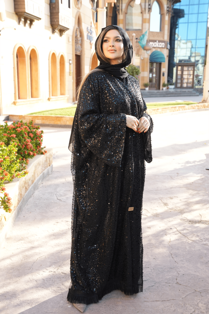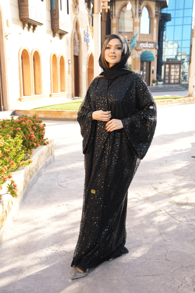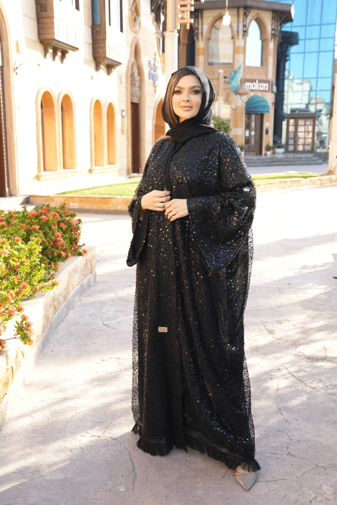 عباية عبارة عن قطعة فخامه ثل فرنسي تطريز بالخرز والترتر الأسود