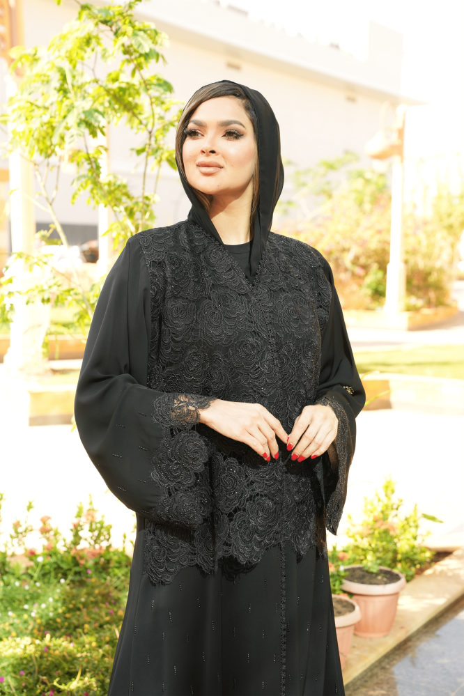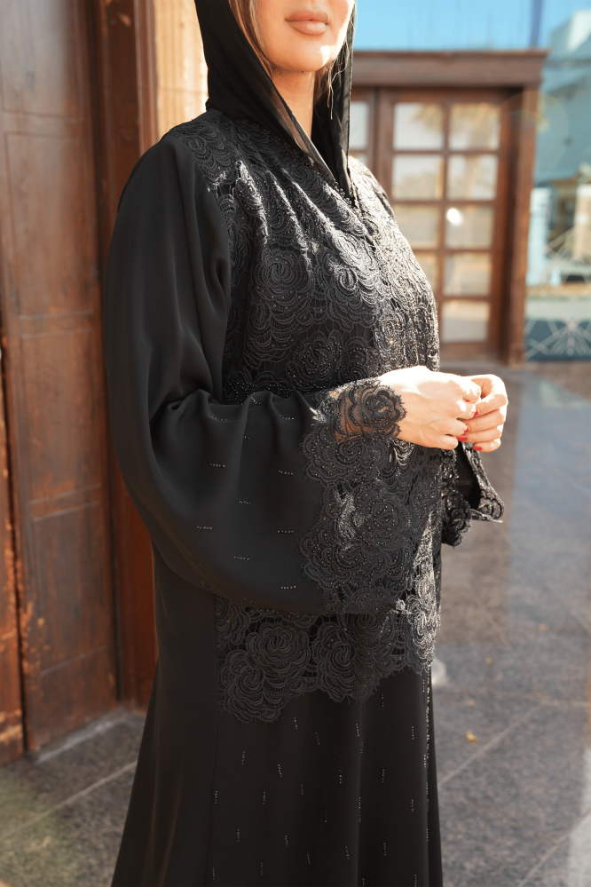 عباية كريب حريري مع سديري من الدنتيل بتطريز فصوص وخرز