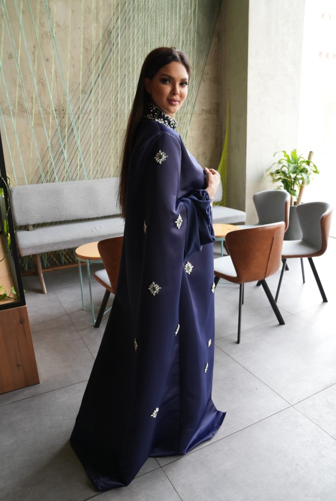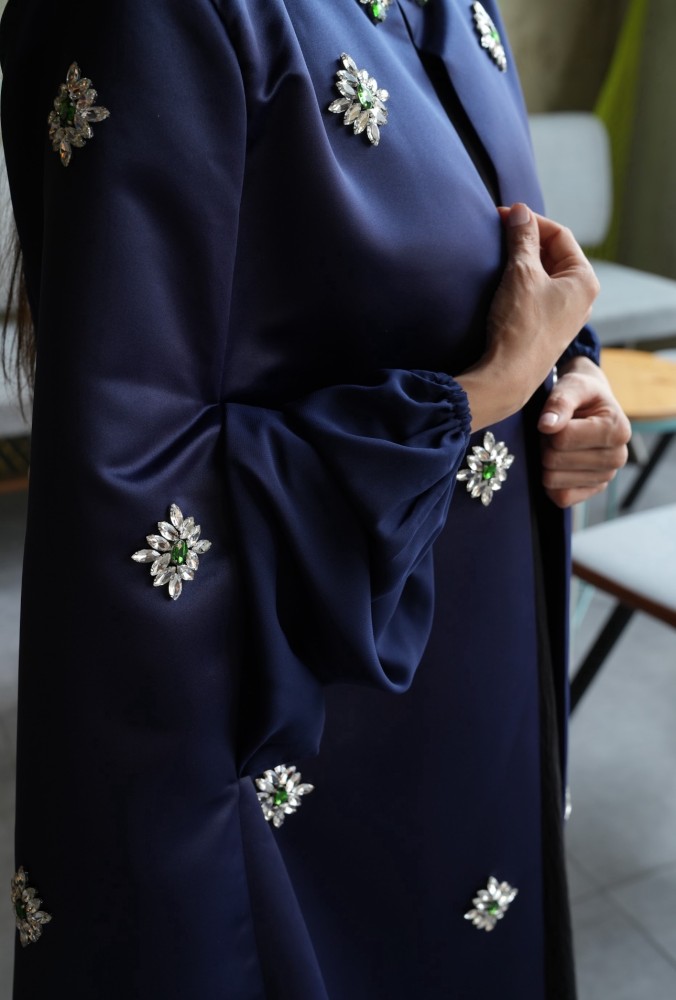 استعدوا لإطلالة أنيقة وعصرية في فصلي الصيف والربيع مع وشاح ملكي كحلي بفصوص فضي وحجر اخضر فاخر. تتميز هذه العباية بتصميمها العصري والمريح، مما يجعلها مثالية للطلعات الصيفية والربيعية. تتميز بتفاصيل التطريز الجميلة.